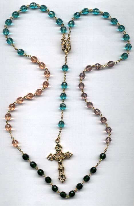 The first 5 bead of the rosary and the first & fifth decades of the Rosary are composed of her birthstone color, March - Aquamarine.
