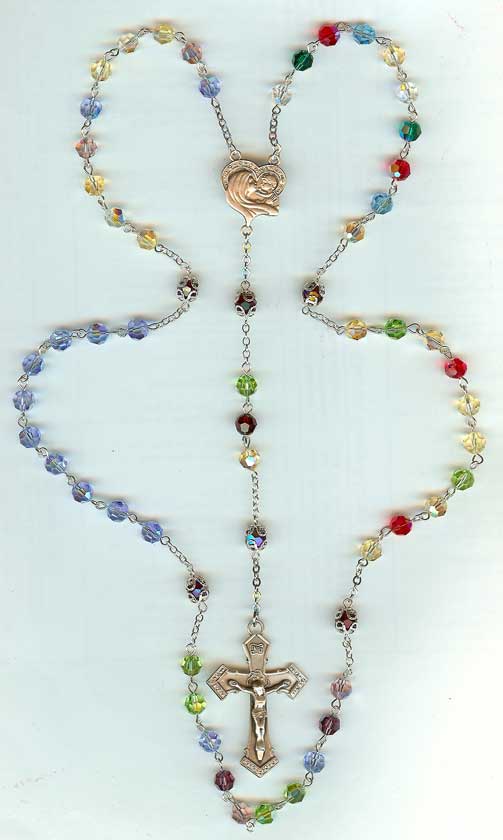 This Rosary is made in Sterling Silver and 7mm Aurora Borealis Beads. It also has Sterling Silver caps on the Garnet Our Father Beads. The Sterling Silver Crucifix and Center stones are Crystal. Birthstone colors shown in this Rosary are Garnet - January, Amethyst, Aquamarine, Crystal, Emerald, Alexandrite, Ruby, Crysolite, Topaz, and Light Sapphire.