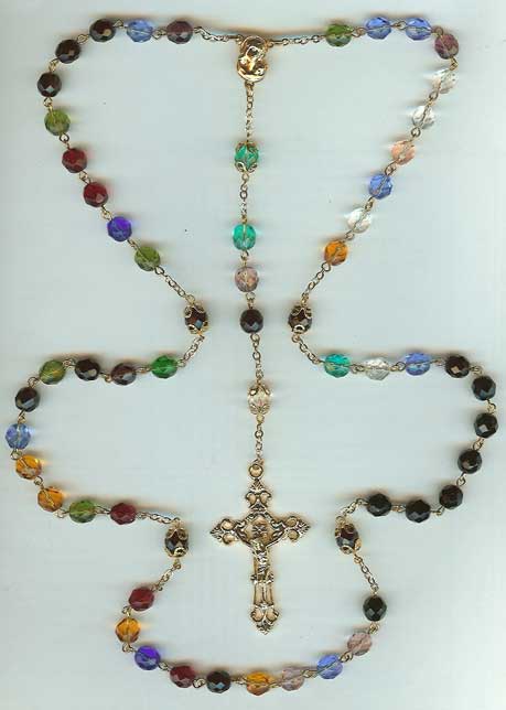 Traditionally black beads are use for religious rosaries. I have chosen in this design of multicolor to use the black beads to show where the fourteen children's birthstones leave off and the twenty-nine grandchildren's birthstones begin. Unless otherwise stated the Dad's birthstone, which is Garnet, will be used for the Our Father Beads.